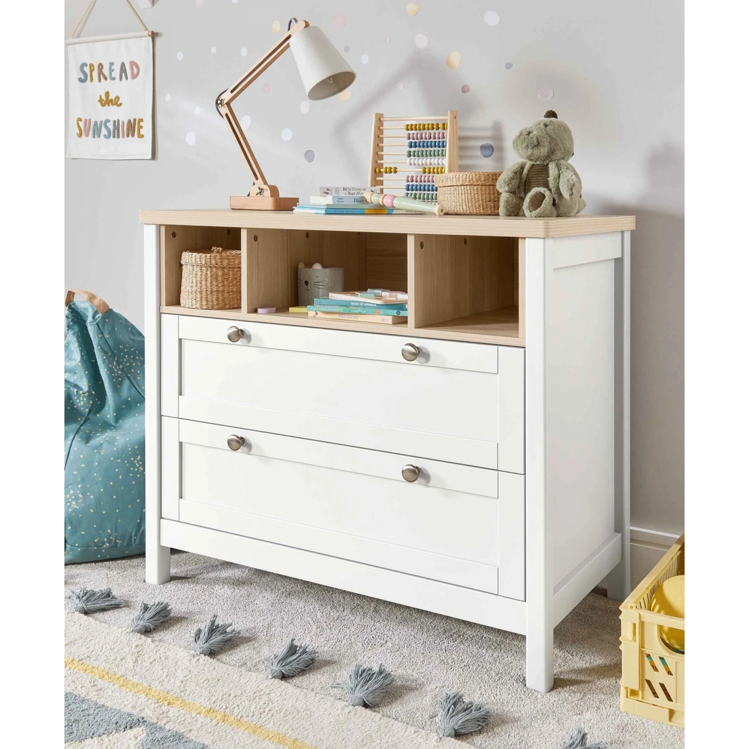 This dresser changer makes changing and dressing your little one easy. It’s got a removable top – so you won’t need to upgrade your furniture when your little one has a growth spurt. And thanks to the drawers and open box-style storage space, there’ll be plenty of room for all of your toddler’s toys and clean outfits.