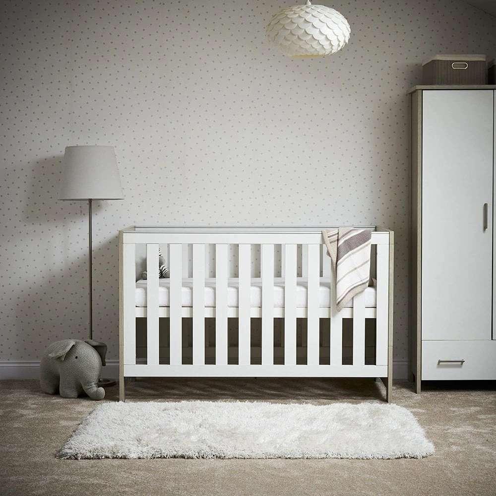 The Obaby Nika range offers a contemporary design, due to its clean lines and textured oak effect finish, that will fit perfectly in today’s modern nursery. This 2 piece room set consists of Nika cot bed and changing unit.