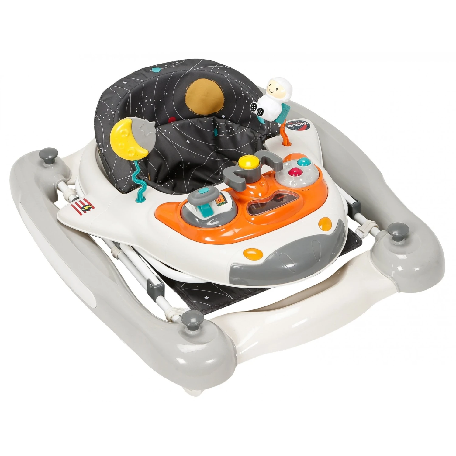 Give your little explorer a cosmic experience on board our out-of-this-world 2 in 1 space shuttle walker/rocker*.Packed with deep space activities including a musical light-up control panel, steering tiller and thruster, moon teether, countdown spinner plus a squeaky friendly astronaut companion, it promises heaps of fun filled freedom. Featuring a soft padded seat and anti-tip pads, the walker folds flat for convenient storage, making it a great solution for smaller homes or apartments.
