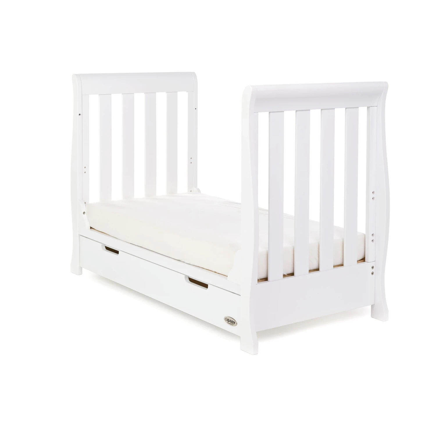 The Obaby Stamford furniture range offers families the perfect combination of style, quality and practicality. For those looking for all of the great features of a full size cot bed but with limited space, the Stamford mini sleigh cot bed is the perfect addition to any nursery. Its elegant scroll design offers traditional styling while its slatted ends add a contemporary touch.